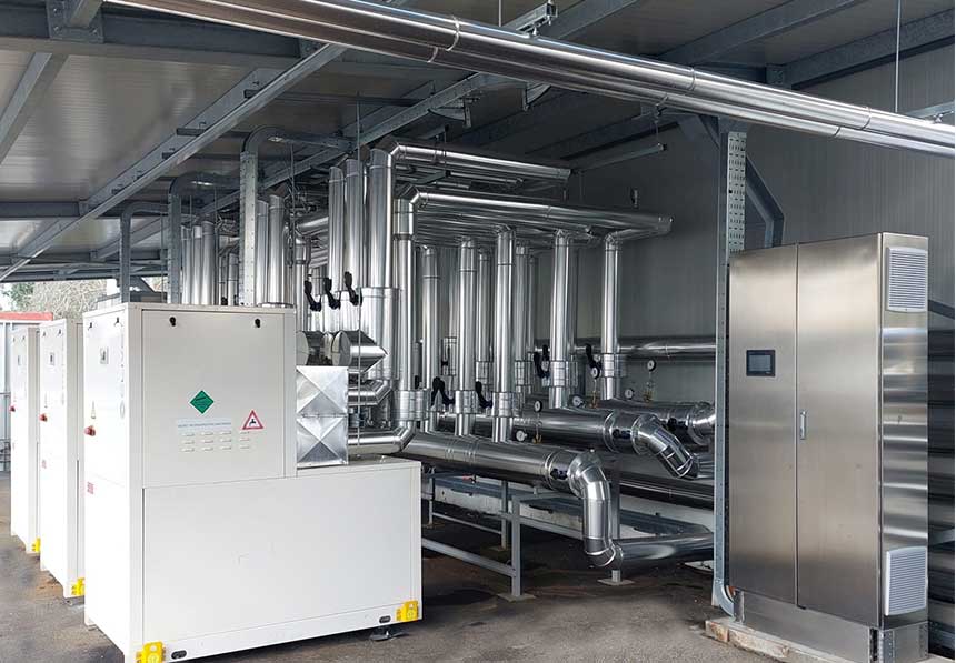 La solution adoptée est basée sur des pompes à chaleur géothermiques eau/eau multifonctionnelles WSHN-XEE2 MF 80.2 fonctionnant en cascade et alimentées automatiquement par l'énergie de refroidissement thermique demandée par le système. Les pompes à chaleur ont une configuration à 4 tuyaux pour répondre simultanément aux besoins d'eau chaude et d'eau glacée.
