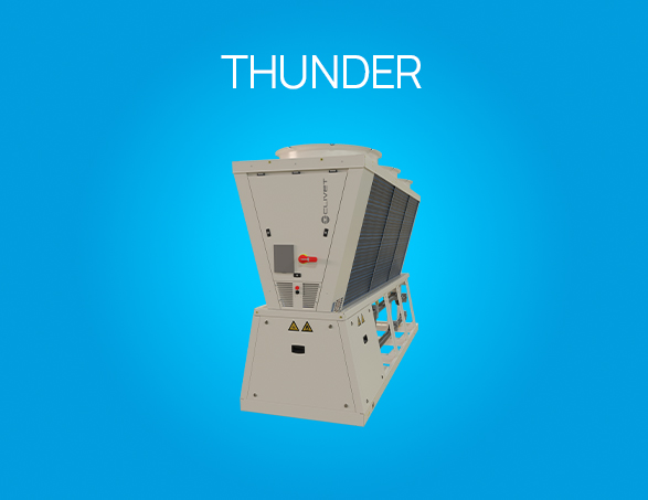 THUNDER (WiSAN-P) est la nouvelle pompe à chaleur réversible à condensation par air pour installation extérieure avec réfrigérant naturel, adaptée à la production d'eau à haute température, équipée de compresseurs scroll inverter spécialement conçus pour l'utilisation du R290, et de ventilateurs inverter.