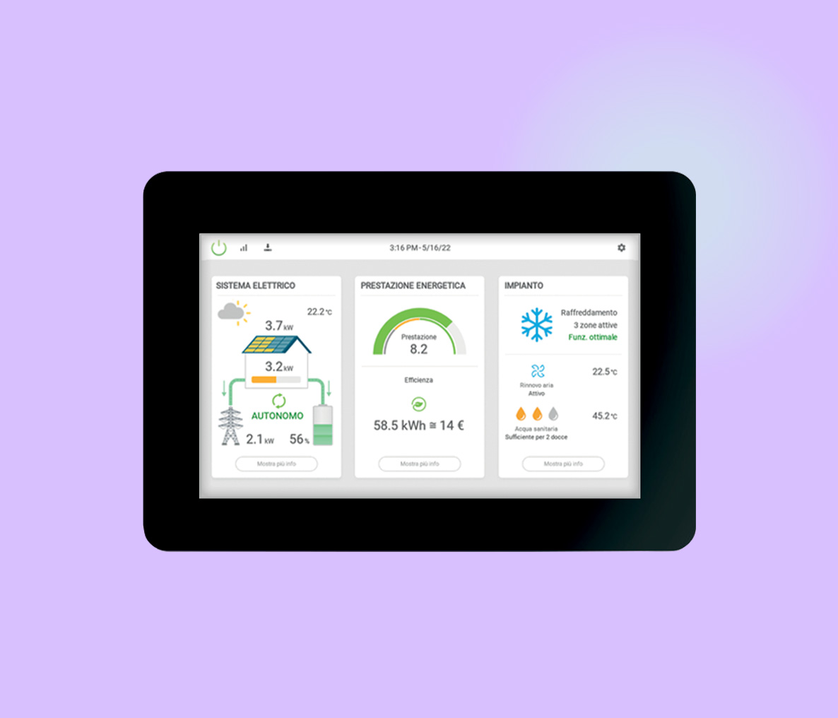 The Clivet Smart Living intelligent system predicts photovoltaic production and adapts home consumption. If there is an excess of energy, it transforms it into thermal storage, maximising efficiency and reducing dependence on the grid.