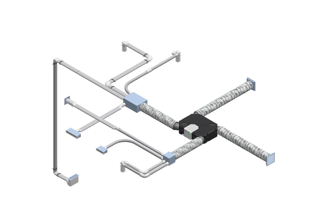 - se vgrajuje podometno in podtalno ter omogoča emisijo in odvod zraka iz prostorov s preprosto in neopazno oblikovanimi sesalniki zraka.