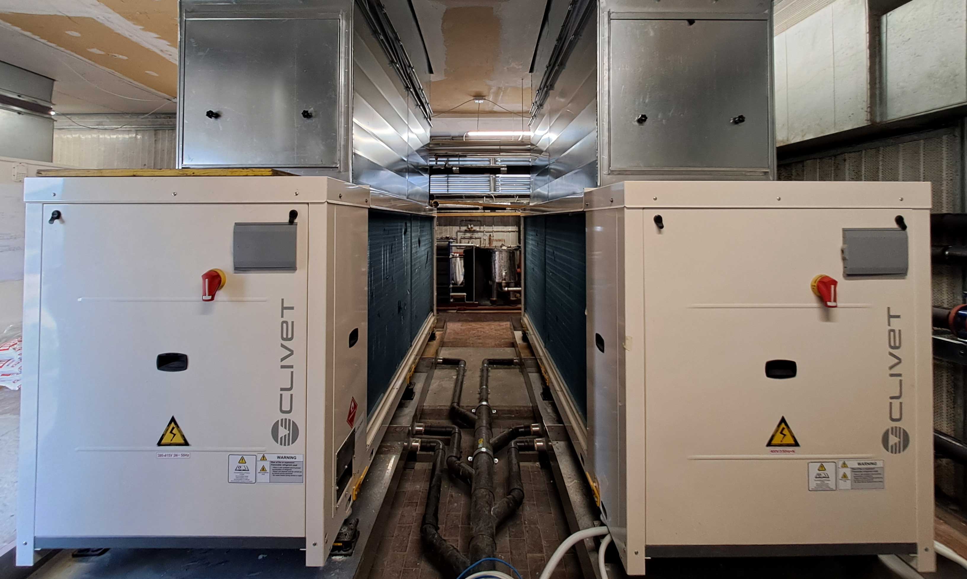 Les deux chaudières ont été remplacées par deux pompes à chaleur à haut rendement avec technologie Inverter et réfrigérant écologique R32 Sheen EVO 2.0 et deux chaudières à condensation de 200 kW, qui sont utilisées comme système d'appoint et d'intégration en cas de demande d'eau à haute température. Les pompes à chaleur peuvent également servir de complément au refroidisseur en cas de pic de demande de refroidissement.